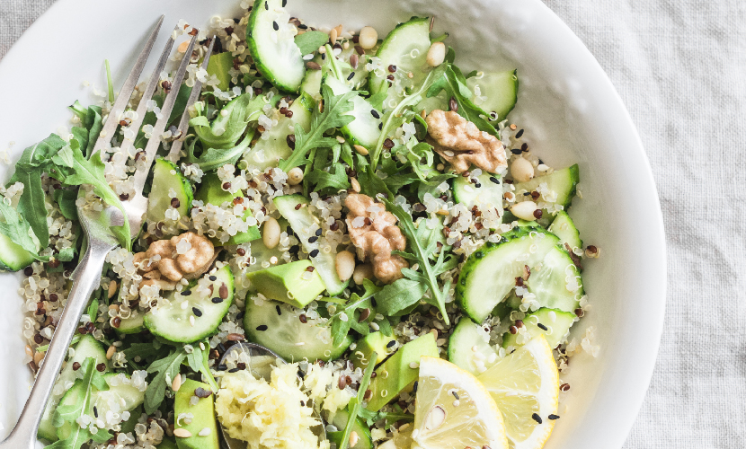 Ingredients: 1kg Quinoa, washed 1 Medium to large Avocado 2 Lebanese or 1 continental cucumber Large handful of rocket Large handful of walnuts 3cm freshly g...