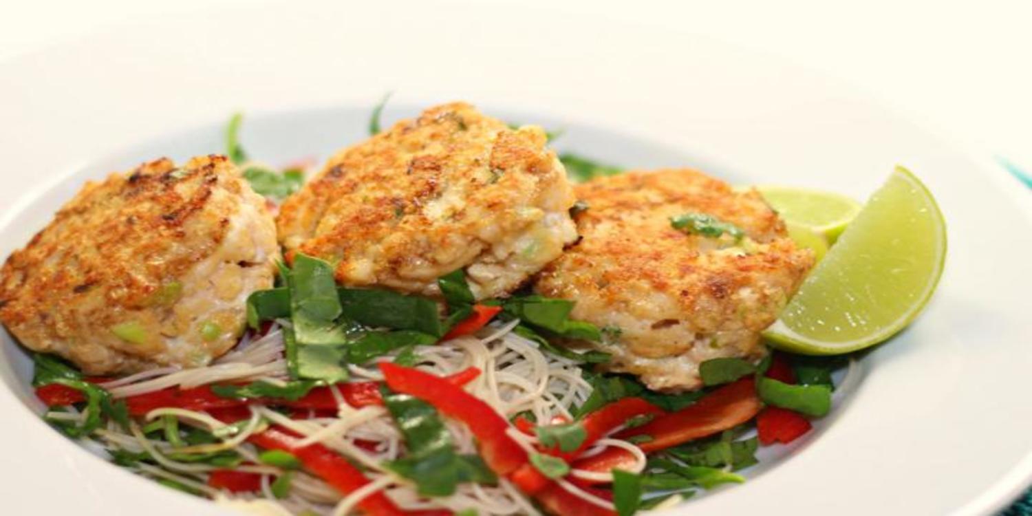 Ingredients: For the fishcakes: 600g firm white fish (such as basa or snapper), finely sliced 1 garlic clove, minced 2 spring onions, chopped 2 tsp lime zes...
