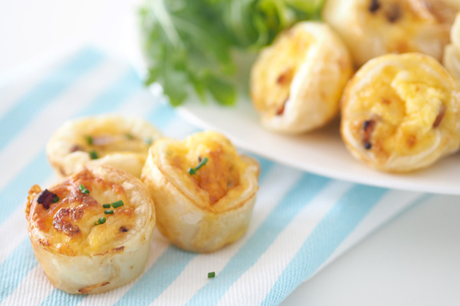 Ingredients: 4 sheets puff pastry, thawed 1 teaspoon oil 4 rashers bacon 1/2 onion, finely chopped 125g tasty cheese, grated 4 eggs 240ml milk Method: Prehea...